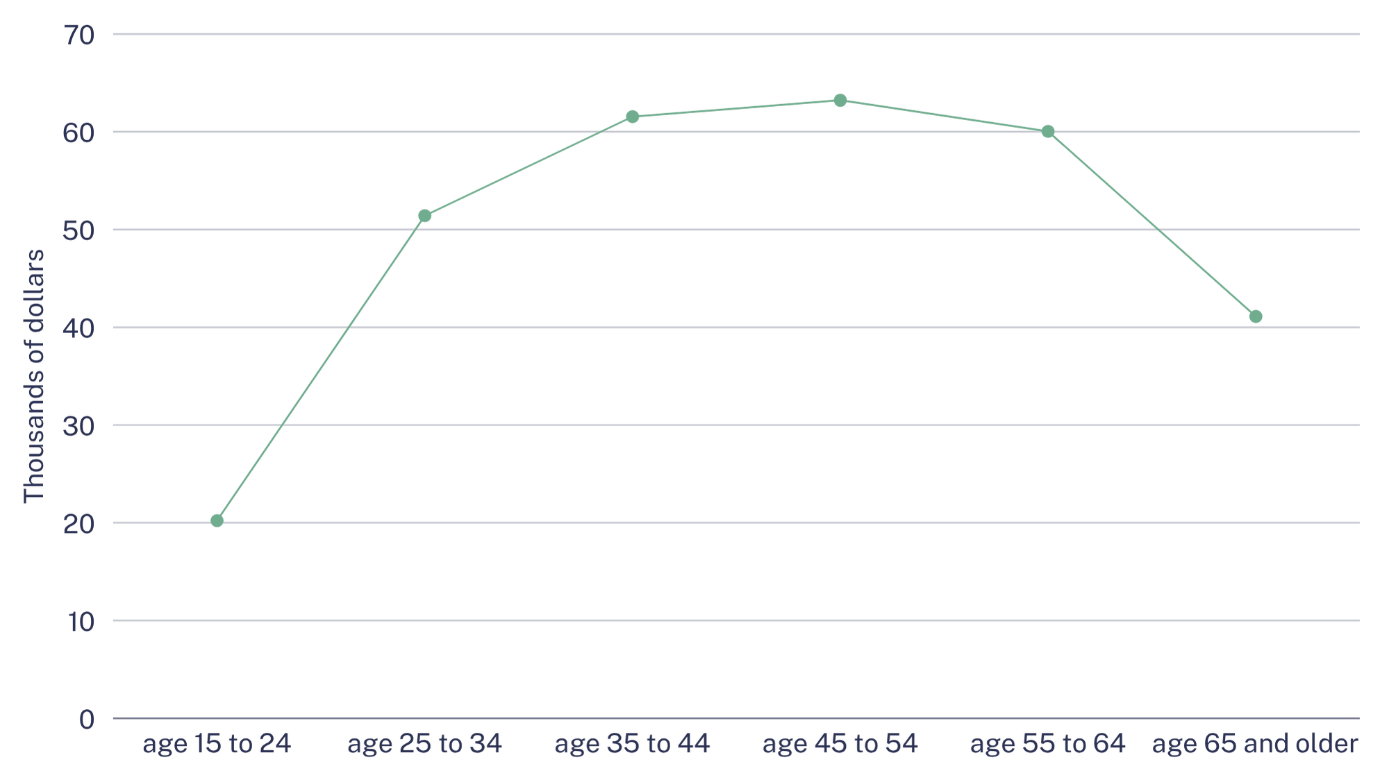 Earnings usually climb with work experience and often peak in the forties or fifties. According to the latest Census data, workers ages 15 to 24 years old earn a median of $20,220 and workers ages 25 to 34 earn a median of $51,420. Median earnings are highest for workers ages 45 to 54 years old at $63,230.