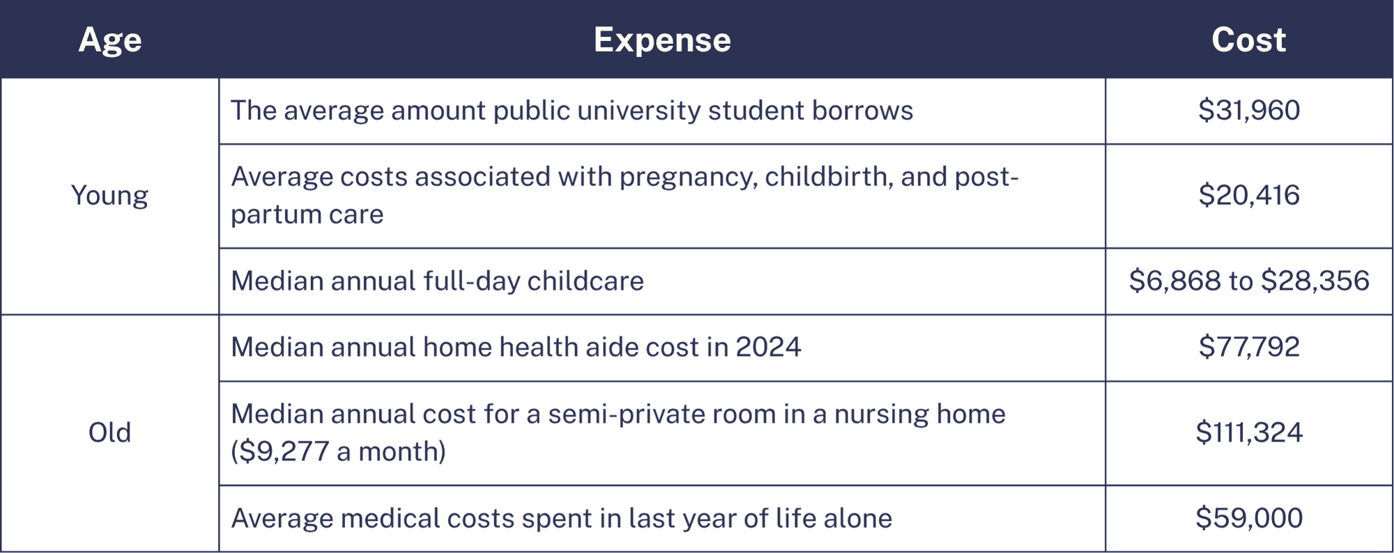 | Life‑cycle Mismatches Big costs arrive when earnings are low, in early career or when we are incapable of working. | A year of full-time child care for just one child ranges from $6,868 to $28,356. Without Social Security, 37% of seniors would be living in poverty. |